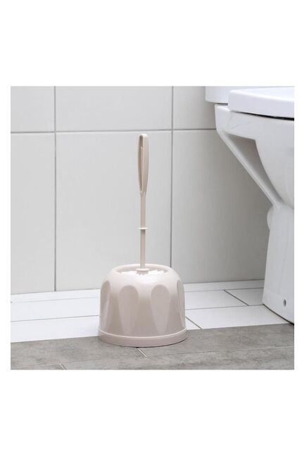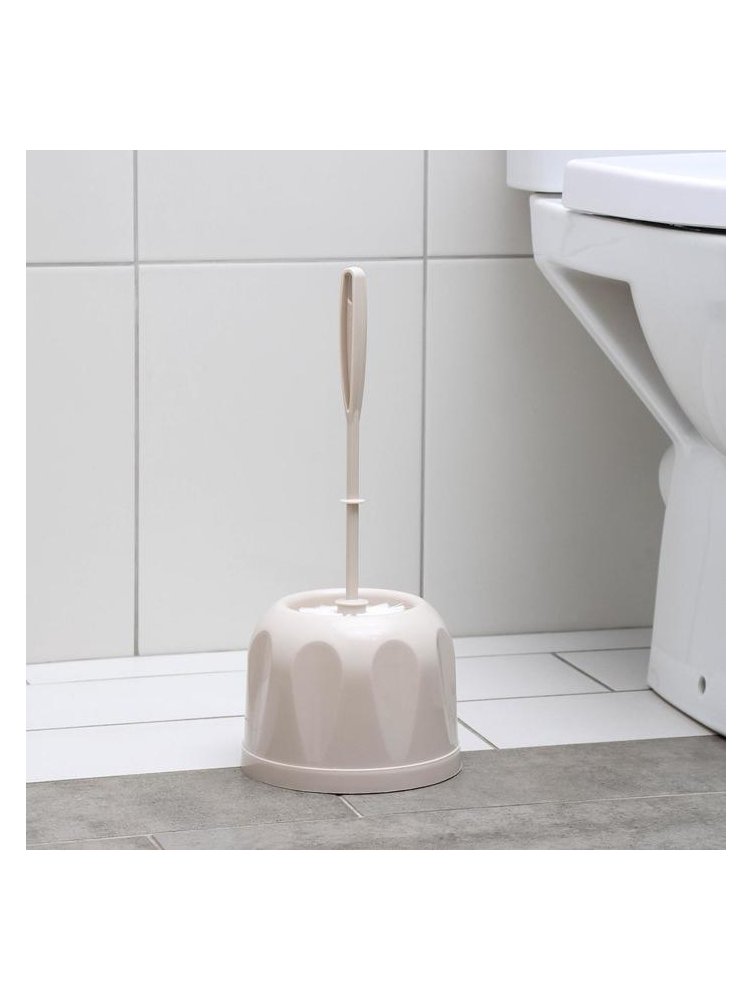Бежевый ерш с подставкой, влагостойкий материал, удобная рукоятка, гигиеничное хранение, компактный размер для аккуратной уборки.