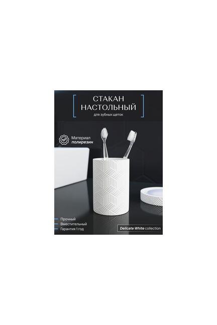 ДxШxВ: 74x74x110 мм Материал корпуса: полирезин Поверхность: матовая Цвет корпуса: белый Белый стакан из полирезина для зубных щеток: устойчив к влаге, прочный, легко очищается, гармонирует с любым интерьером ванной комнаты.