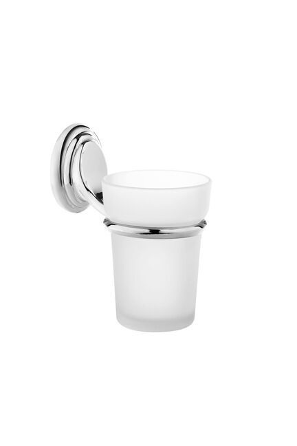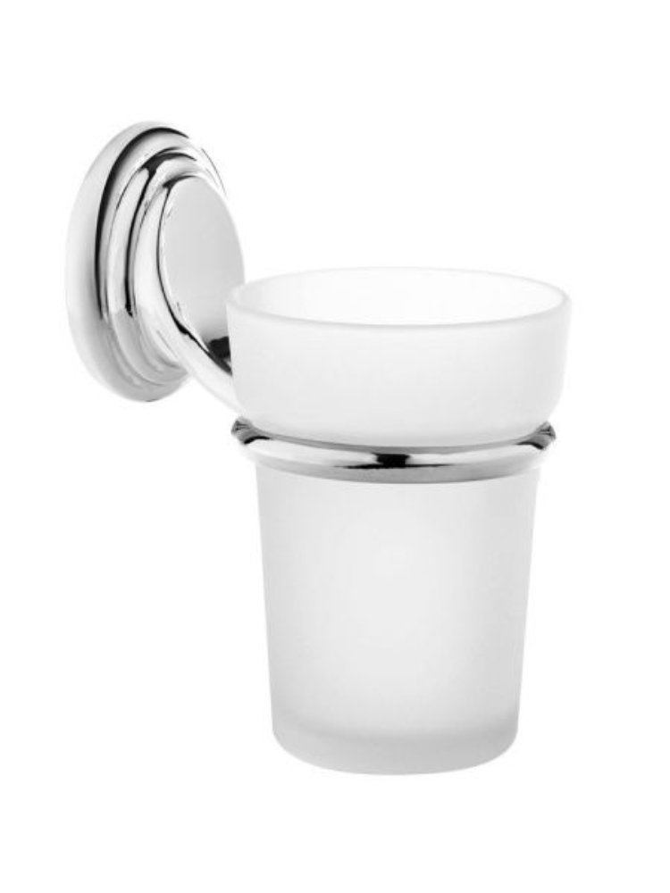 Стеклянный стакан с настенным креплением и хромированным держателем, отлично подходит для ванных комнат, устойчив к влаге и удобен в уходе.
