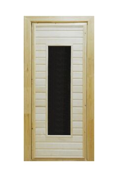Стандартные размеры дверей : 1800*700мм. по коробу, толщина 40мм Конструкция дверей: каркасно-щитовая каркас и короб двери - сосна облицовка - липовая вставка "Стекло бронза" прозрачное с обеих сторон Вставка«Стекло бронза прозрачное с обеих сторон», изготовлена из 2-х стёкол толщиной 4мм, воздушная прослойка между стеклами служит теплоизолятором . Тем самым стекло становится устойчивым к температурным перепадам. Дверь прочная и влагоустойчивая Двери из липы не требуют особого ухода Древесная липа не содержит смолы, и соответственно не выделяет ее на поверхности, что является неоспоримым плюсом при использовании такой двери в любом помещении. Возможно изготовление по индивидуальным размерам. Тип двери: Остекленные Материал: Дерево и стекло Серия дверей для бани и сауны: ПО Толщина двери: 40 мм Банная дверь из липы с окошком, размер 1800×700 мм, устойчива к влаге и высоким температурам, проста в установке для парных и саун.