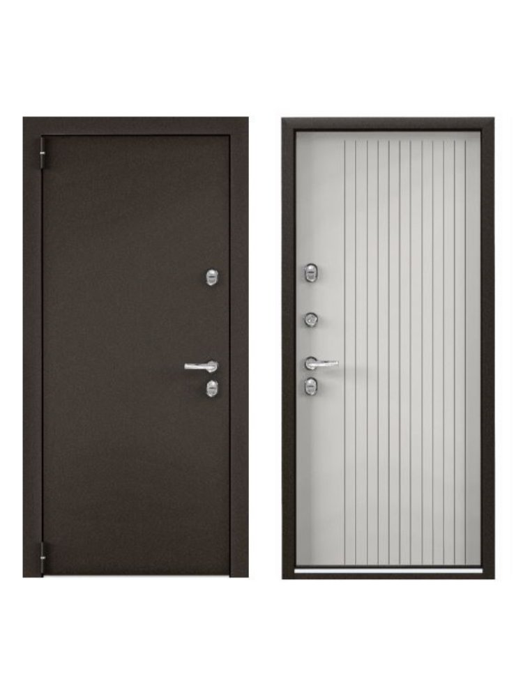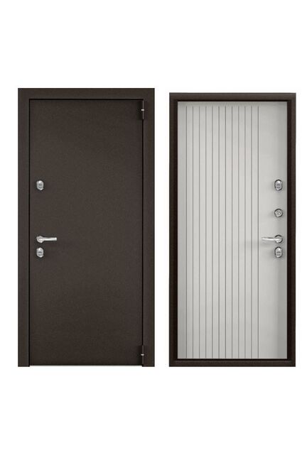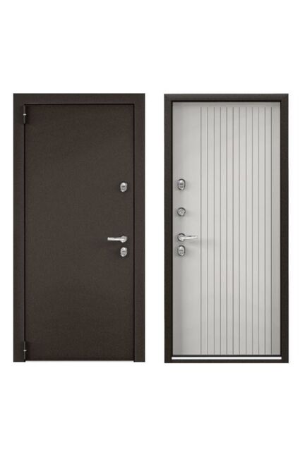 Тип внешней отделки: порошково-полимерное покрытие. Тип внутренней отделки: панель МДФ с ПВХ покрытием. Верхний замок: BORDER 3В 8-8Г/15, 4-го класса взломостойкости по ГОСТ 5089-2011. Нижний замок: Crit A30-4Л, 2-го класса вломостойкости по ГОСТ 5089-2011. Декоративные накладки на ключевину сувальдного замка с направляющими для ключа и подпружиненными шторками от продувания. Противосъемные ригели с петлевой стороны полотна 2 шт. Ночная задвижка.