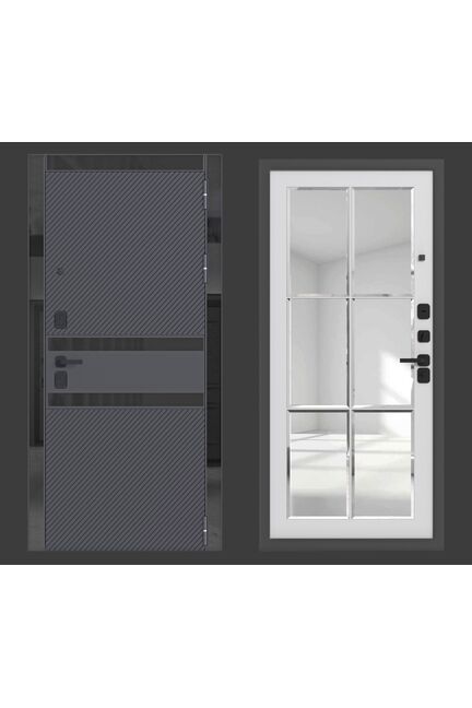 Наличник: МДФ 98 мм., вставки стекло чёрное.Петли: 3 шт., наружные, открывание 180°.Размеры: 960х2050, 860х2050.Ориентация: Правая и левая.Производитель: Россия.Толщина полотна: 90 мм.Глубина коробки: 115 мм.Внешнее покрытие: Порошково-полимерное покрытие Чёрный муар с блёстками. МДФ-панель 16 мм., вставки стекло чёрное с еврокромкой. Цвет: Софт чёрный.Внутреннее покрытие: МДФ-панель 12 мм., зеркало с фацетом. Цвет: Софт белый.Толщина металла: 1,2 мм.Наполнение: Базальтовая плита.Уплотнитель: 3 контура уплотнения.Основной замок: Guardian цилиндровый (ключ-вертушка).Дополнительный замок: Guardian цилиндровый (ключ-ключ).Броненакладка: Есть.Ночная задвижка: Есть.Фурнитура чёрная: Fuaro.