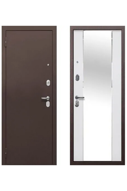 Конструкция: Цельногнутые полотно и короб. Толщина металла: 1,2 мм. Толщина полотна: 90 мм. Наполнение: минеральная плита. Внешнее покрытие: атмосферостойкое полимерное покрытие «Антик Серебро». Внутреннее покрытие: МДФ — панель 10 мм, цвет Эмалит белый, с зеркалом. Замки: цилиндровый/сувальдный Zirh Kilit. Ручка раздельная Хром, глазок, 3 петли, Независимая ночная задвижка.
