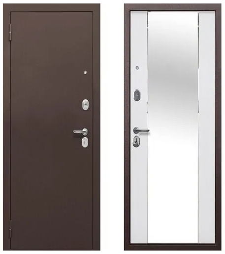 Конструкция: Цельногнутые полотно и короб. Толщина металла: 1,2 мм. Толщина полотна: 90 мм. Наполнение: минеральная плита. Внешнее покрытие: атмосферостойкое полимерное покрытие «Антик Серебро». Внутреннее покрытие: МДФ — панель 10 мм, цвет Эмалит белый, с зеркалом. Замки: цилиндровый/сувальдный Zirh Kilit. Ручка раздельная Хром, глазок, 3 петли, Независимая ночная задвижка. Стальная дверь 9 см с утеплением и зеркалом, отличная тепло- и шумоизоляция, прочность, два замка. Идеальный вариант для квартиры или дома.