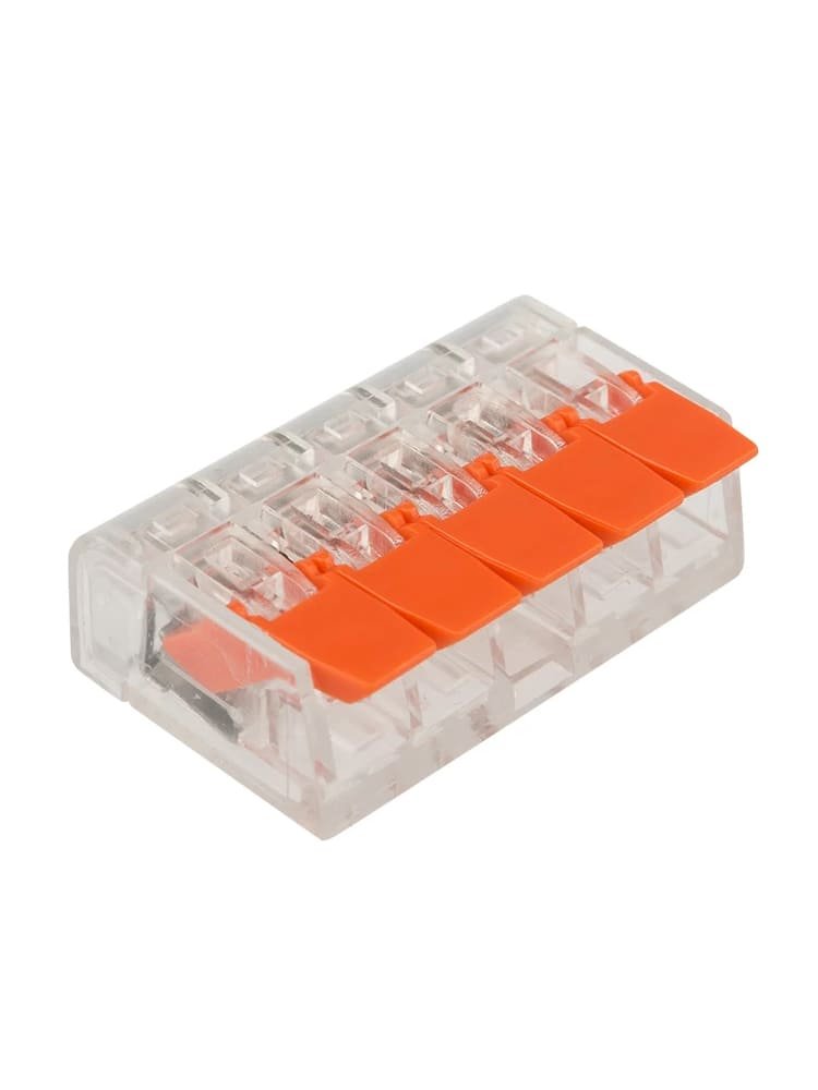 5 контактов для проводов 0,14–4 мм², быстрый монтаж, безопасное соединение, прозрачный корпус, выдерживает до 32А и 450В, подходит для всех типов проводов.