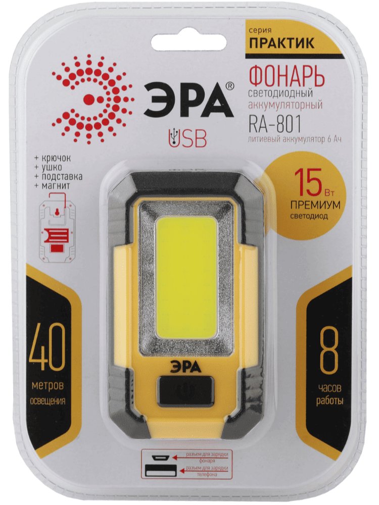 ЭРА RA-801 мощный фонарь-powerbank с литиевым аккумулятором. Яркий свет + возможность оперативно подзарядить любое мобильное устройство. Два функциональных гаджета в одном! Незаменимая вещь в путешествии, за городом, на строительных и ремонтных работах. Мощный литиевый аккумулятор 6 мАч - гарантия бесперебойной работы устройства в течение 8 полных часов. USB-шнур в комплекте Яркий 15Вт COB-фонарь с аккумулятором, Powerbank, магнитным креплением, крючком – для стройки и ремонта, автономная работа и удобство использования.