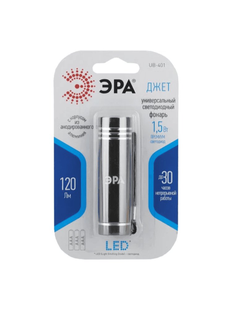 Универсальный фонарь ЭРА UB-401 Джет 1,5Вт COB, алюминий, 3xAAA, с корпусом из анодированного алюминия. Такой корпус очень надёжный, не подвергается коррозии, очень прочный и долговечный. Этот фонарь компактный и очень простой, он создан для повседневного использования в быту. Именно поэтому он сделан из качественного материала. Особенность светодиодных фонарей ЭРА - светодиоды нового поколения. В фонаре "Джет" использованы светодиоды премиум класса, они на 50% ярче стандартных и имеют цветовую температуру 6000К. Это значит, фонарь светит ярким белым светом, приближенным к естественному, и не отдаёт в синеву. Фонарь обеспечивает до 30 часов непрерывной работы с мощностью в 1,5 Вт. Этого более чем достаточно для использования в городских условиях. Дальность луча "Джет" - 120 метров. Фонарик легко носить и хранить, с ремешком, который позволит прицепить фонарик к карману или повесить на сумку. "Джет" - маленький, качественный фонарик для самых разных бытовых нужд. Компактный фонарь: COB 1,5Вт, работает от 3х A