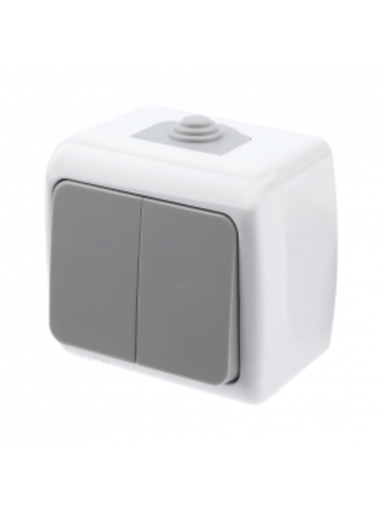 2-клавишный выключатель 10А, степень защиты IP54, устойчив к влаге и пыли, подходит для наружной установки в сложных условиях.