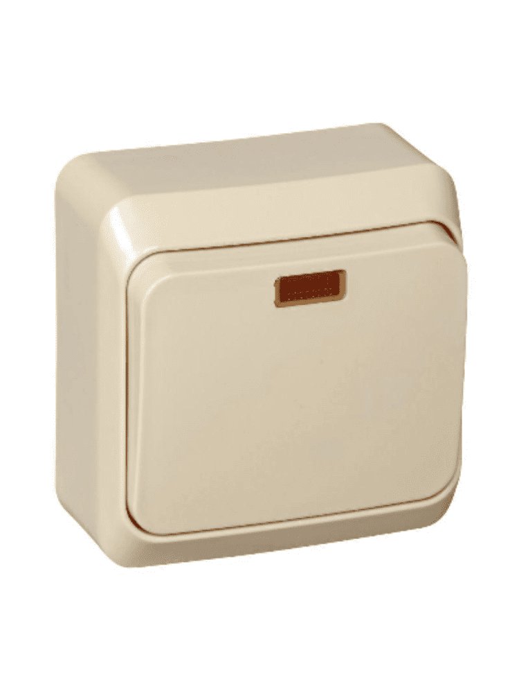 Одинарный выключатель с подсветкой, 10А, монтаж накладной, кремовый корпус — простая установка,  удобство поиска в темноте.