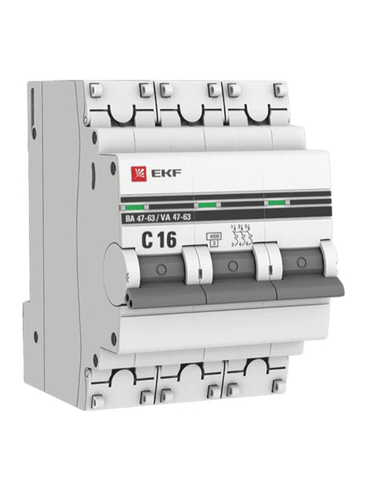 Автоматический выключатель 3P 16A (C) 4,5кА EKF PROxima обеспечивает защиту цепей от перегрузок и КЗ. Надежный, компактный, для бытовых и коммерческих сетей.