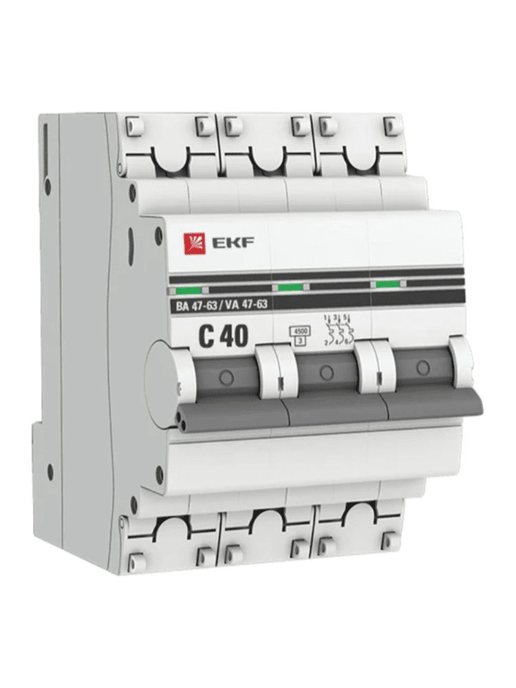 Автомат 3P 40A (C) 4,5кА BA 47-63 EKF PROxima - надежный 3-полюсный выключатель с отключающей способностью 4,5 кА для защиты сетей от перегрузок и КЗ.