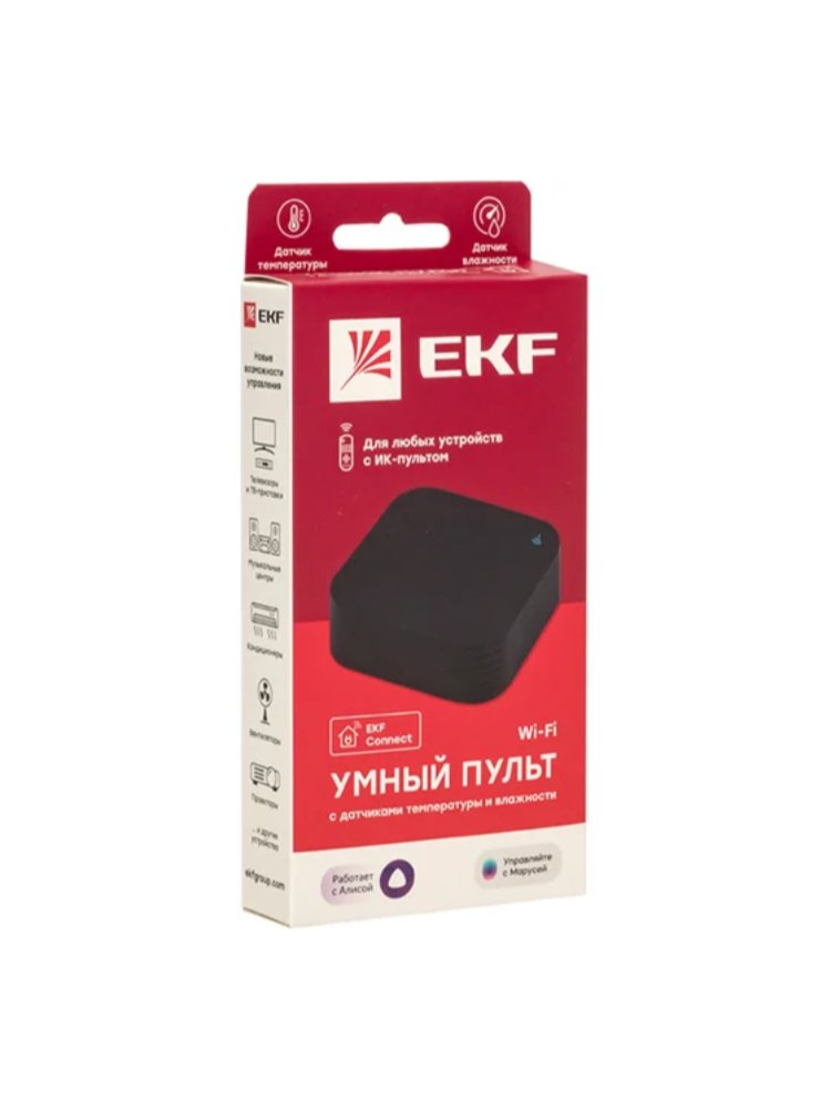 Умный пульт EKF Connect позволяет управлять любыми устройствами, у которых есть свой ИК-пульт, через приложение и через голосовые помощники Алису от Яндекса и Марусю от VK. Примеры устройств, которыми можно управлять - кондиционеры, телевизоры, музыкальные центры. В умный пульт встроены датчики температуры и влажности, что позволяет не только видеть эти параметры в приложении EKF Connect, но и создавать автоматические сценарии, например, чтобы кондиционер включался, когда температура превышает заданное значение, а умная розетка с увлажнителем включалась, когда влажность становится слишком низкой.