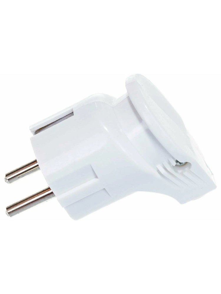 Угловая вилка 16А с заземлением, белая, компактная и безопасная. Идеальна для подключения бытовых и строительных приборов в ограниченном пространстве.