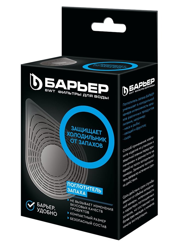 Компактный помощник для кухни. Поглотитель запаха БАРЬЕР идеально подходит для бытовых холодильников любого объёма. Абсолютно безопасный природный состав. На 100% состоит из активированного угля. Натуральный сорбент способен полностью поглощать неприятные запахи, не выделяя собственных. Уменьшает интенсивность запахов различных продуктов питания, например мяса и рыбы, овощей и фруктов, сыра. Не содержит вредных химических веществ, не имеет запаха. Безопасен для окружающей среды. Быстро устраняет неприятные запахи в холодильнике, безопасен для продуктов, действует до 3 месяцев, компактен и прост в использовании.