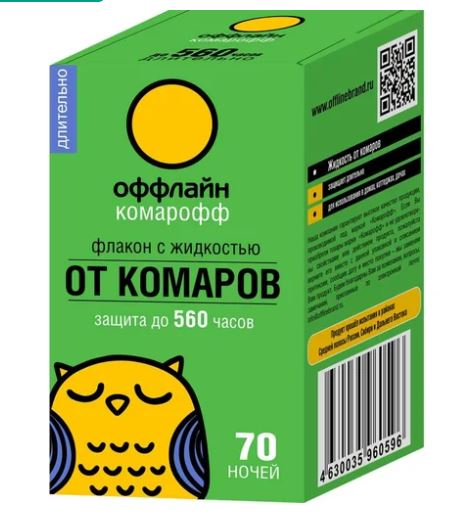 Жидкость Комарофф оффлайн ДЛИТЕЛЬНО 70 ночей, без запаха, флакон 45 мл обеспечит спокойный сон всю ночь без комаров. Один флакон объемом 45 мл рассчитан на работу в течение 70 ночей. При открытых окнах рекомендуется оставлять прибор с жидкостью включенным на всю ночь для защиты от залетающих комаров.