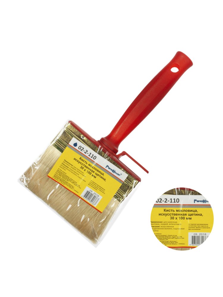 Искусственная белая щетина 100%. Кончики щетины на конце расщеплены для лучшей впитываемости краски. Бандаж изготовлен из жести порытой лаком. Для надежного удержания щетины используется клей на эпоксидной основе и деревянные клинья. Рукоятка изготовлена пластика. Назначение: Предназначена грунтовок, лазурей и антисептиков. Используется для работы на больших площадях. Макловица 30×100 мм с синтетической щетиной и пластиковой ручкой для быстрого нанесения красок и грунтов на большие поверхности, легко моется.
