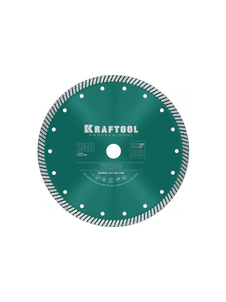 Диск алмазный отрезной турбо Turbo KRAFTOOL 36682-230 предназначен для резки бетона и кирпича с помощью угловой шлифовальной машины. Оснащен технологией горячего двойного спекания под давлением DHP (Double Hot Pressing),которая обеспечивает высокую плотность алмазного слоя, повышенную скорость реза и большой рабочий ресурс диска. Гарантирована эффективная работа без применения охлаждения. Для резки армированного бетона и кирпича, диаметр 230 мм, усиленная турбированная кромка, высокий ресурс, чистый и быстрый пропил.