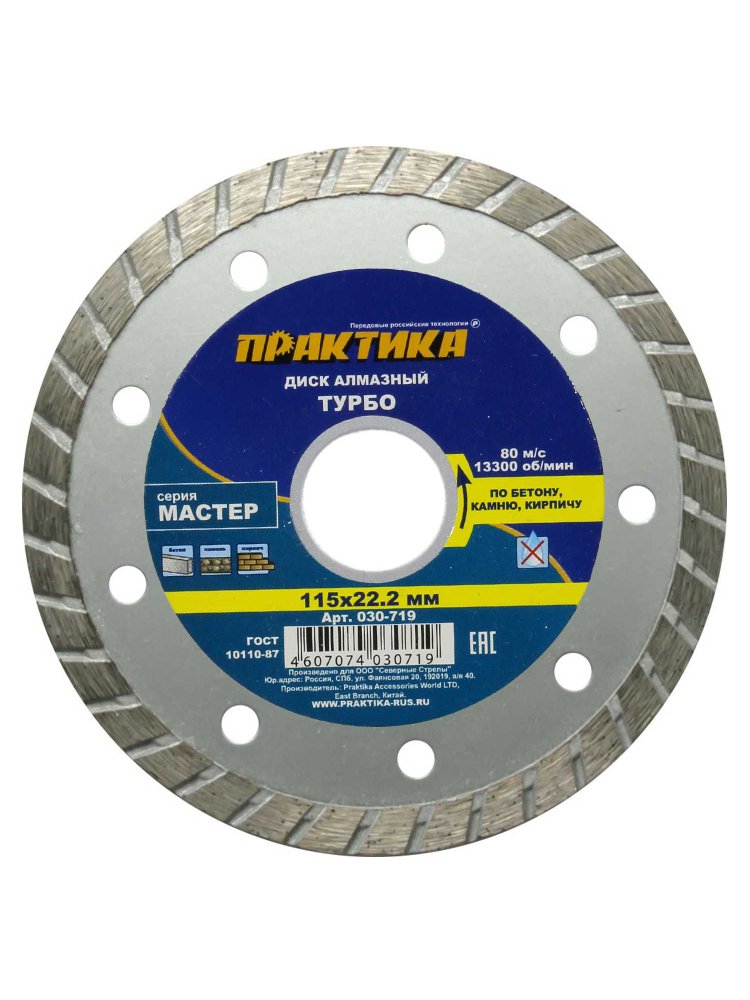 Серия «Мастер». Тип TURBO. Сегмент 10 мм. ГОСТ 10110-87. Алмазные диски для широкого спектра строительных материалов: кирпич, бетон, искусственный и натуральный камень. Очень высокая скорость резания. Для ручного электроинструмента. Способны разрезать тонкую арматуру в бетоне. Не для абразивных материалов. Сухой рез. Охлаждение водой увеличивает ресурс диска. Турбированный алмазный диск 115x22 мм для чистого реза плитки, кирпича и камня. Универсальность, износостойкость, ускорение работы.