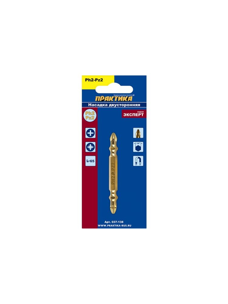 Двусторонняя бита PH-2/PZ-2 65 мм с титановым покрытием — идеальный выбор для точных и прочных работ с различными видами крепежа. Оптимальна для строительных, монтажных и отделочных задач, обеспечивая быстрый и удобный переход между различными типами шлицов без смены инструмента.