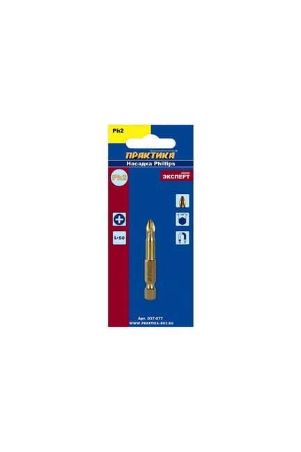 Насадки отверточные Phillips. Магнитные. Серия "Эксперт". Отверточные насадки ПРАКТИКА серии «Эксперт» идеально подходят для профессионального применения. Улучшенная геометрия позволяет наиболее четко фиксировать насадку в шлице самореза, сводя до минимума вероятность срыва, что существенно увеличивает ресурс насадки и не повреждает шлицы и поверхность материала. Дополнительно для улучшения сцепления со шлицом при закручивании длинных саморезов на рабочую часть насадки нанесены специальные насечки (ACR) увеличивающие поверхность сцепления. Специальная хромванадиймолибденовая сталь (CrVMo) и температурная обработка токами высокой частоты (ТВЧ) обеспечивают наибольшую поверхностную твердость 60-61 HRC в сочетании с достаточной вязкостью острия насадки, что полностью исключает, как единовременное сворачивание насадки, так и ее излом. Покрытие нитридом титана (TiN) обеспечивает дополнительное упрочнение поверхности рабочей части насадки. Магнитные свойства позволяют удерживать саморез в л
