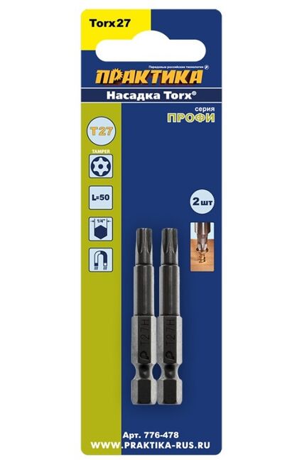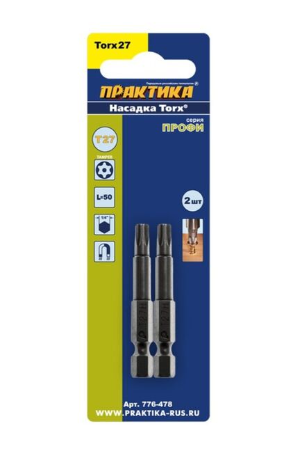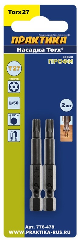 Биты TORX 27 длиной 50 мм из прочной стали для точного и надёжного монтажа крепежа. Удобны для труднодоступных мест. 2 штуки в комплекте.