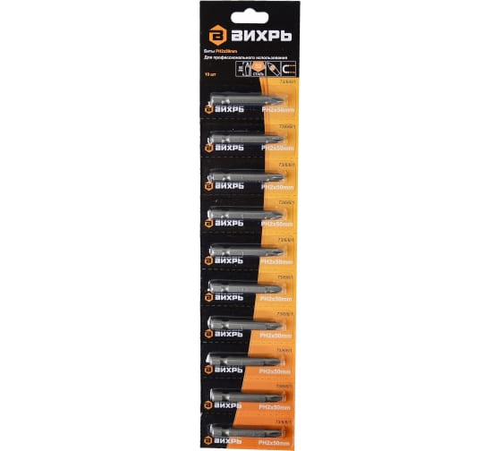 Бита Вихрь - предназначена для использования в качестве насадок в шуруповёртах, аккумуляторных отвёртках, ручных и реверсивных отвёртках со сменными насадками. Изготовлены биты из высококачественной инструментальной стали марки S2. Наконечник типа PН2 (Phillips) - крестообразный наконечник. Длина бит 50 мм. Твердость биты составляет 59-62 HRС. Основу биты составляет шестигранный хвостовик размером 6,35 мм (1/4 дюйма). Надёжная PH2 бита длиной 50 мм из прочной стали для точного монтажа саморезов, устойчива к износу, подходит для всех стандартных шуруповёртов.