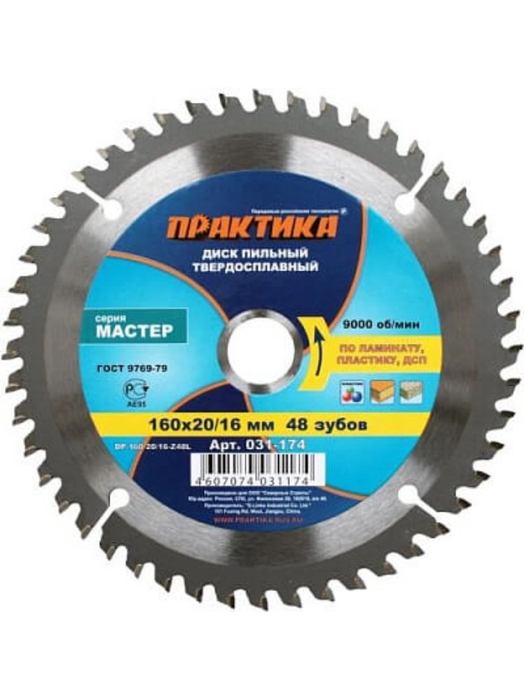 Пильные диски по ламинированным материалам, ДСП, пластику. ГОСТ 9769-79. Серия "Мастер". Высококачественные пильные диски для ручных дисковых пил и станков. Твердость тела HRC 45-46, напаек из карбида вольфрама (сплав ВК8) HRC. 90-93. Угол атаки зуба + 10°. Для чистого и точного распила ламината и ДСП, 48 тонких зубьев, диаметр 160 мм, универсальная посадка 20/16 мм, высокая износостойкость.