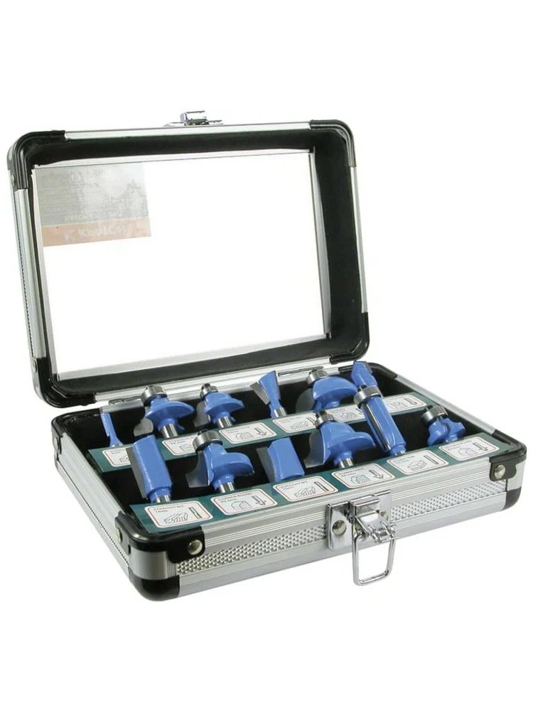 1) Прямая пазовая – 2 шт 2) Пазовая галтельная 3) Ласточкин хвост 4) Галтельная с V-образным наконечником 5) Кромочная конусная 45гр с подшипником 6) Кромочная прямая 7) Кромочная калевочная – 5 шт Многофункциональный набор фрез из 12 предметов для фрезеровки дерева и ЛДСП. Износостойкий сплав, хвостовик 8 мм, удобный кейс.