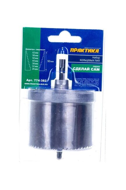 Min диаметр: 26 мм Max диаметр: 63 мм Центрирующее сверло в комплекте: есть Держатель в комплекте: есть Количество коронок: 7 шт Max глубина сверления: 50 мм Набор из 7 кольцевых пил диаметром 26-63 мм для точных отверстий в дереве. Прочные, универсальные, простой монтаж в любом дреле.