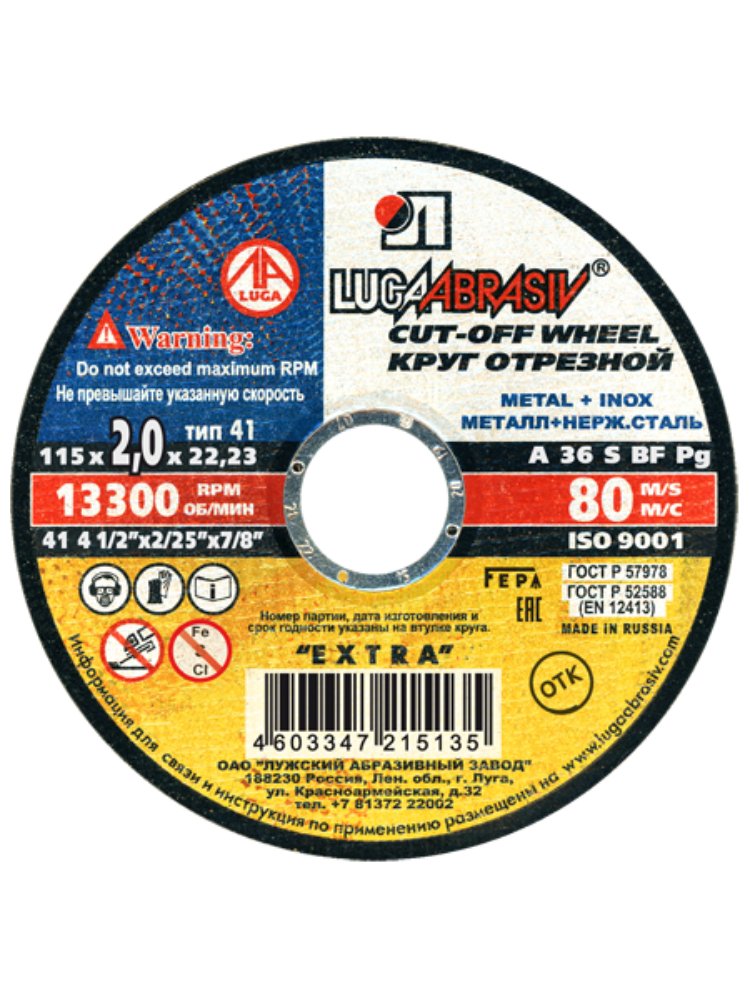 Круг отрезной по металлу и нерж. ЛУГА Extra 115*2,0*22мм