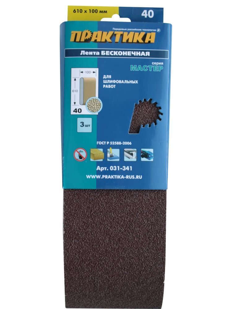 Ленты шлифовальные бесконечные. ГОСТ 22776-77. Серия "Мастер" Изготовлены из высококачественного абразивного материала на резинотканевой основе. Абразивный слой изготовлен из оксида алюминия (электрокорунд - Al203). Высокая эффективность шлифования. Большая долговечность. Лента с зернами из электрокорунда особенно подходит для материалов дающих длинную стружку таких как дерево и металл. Абразивная лента 100x610 мм Р40, 3 шт. для быстрого и эффективного грубого шлифования дерева и металла в строительных и отделочных работах.