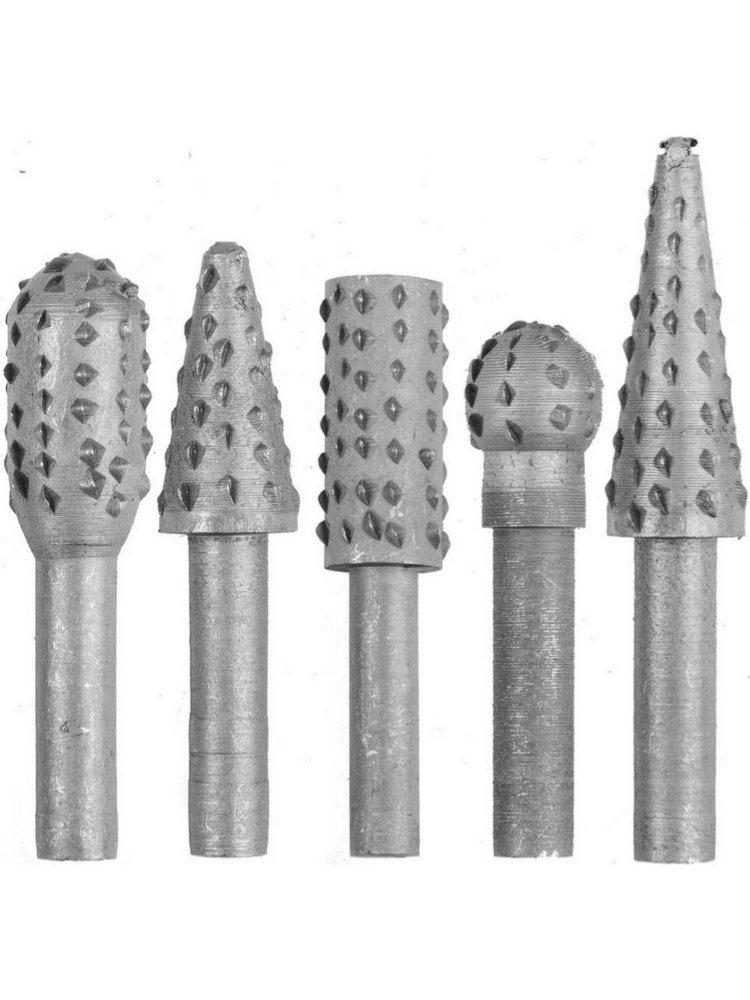 • В комплекте 5 шарошек различных форм — цилиндрическая, конические, сферическая, заострённая и конико-цилиндрическая