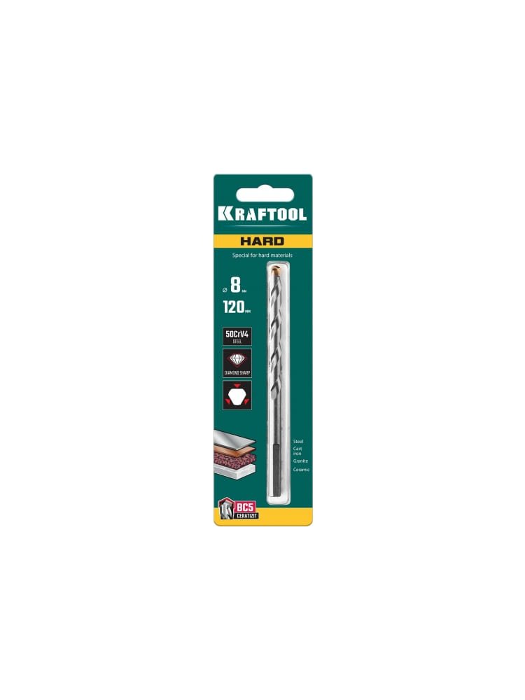 Сверло специальное по твёрдым материалам KRAFTOOL Hard 8x120 мм 29177-120-8 подходит для сверления быстрорежущих сталей, подшипниковой стали,чугуна,керамики,гранита,а также бетона и кирпича. Используется с дрелями и перфораторами со сверлильным патроном в безударном режиме сверления. При работе по бетону и кирпичу допускается сверление с ударом. Твердосплавное сверло 8×120 мм для точного сверления плитки, стекла и гранита. Обеспечивает чистый срез и высокую износостойкость.