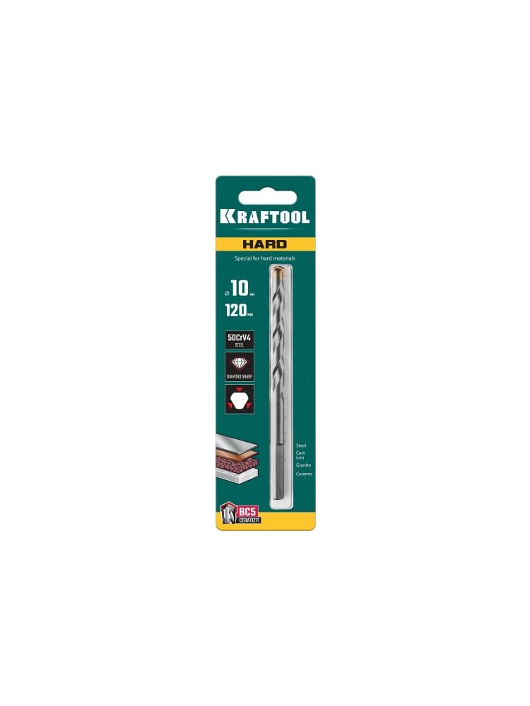 Сверло специальное по твёрдым материалам KRAFTOOL Hard 10x120 мм 29177-120-10 подходит для сверления быстрорежущих сталей, подшипниковой стали,чугуна,керамики,гранита,а также бетона и кирпича. Используется с дрелями и перфораторами со сверлильным патроном в безударном режиме сверления. При работе по бетону и кирпичу допускается сверление с ударом. Точность сверления, долговечный сплав, устойчивость к перегреву — идеален для аккуратной работы с керамикой, кафелем, стеклом и гранитом.