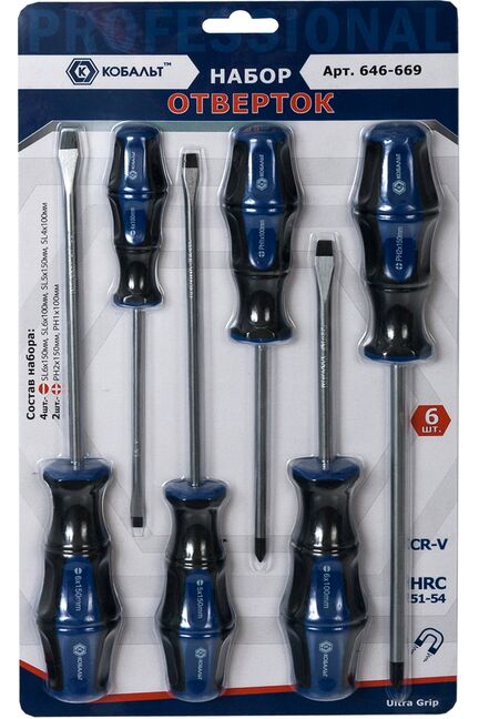 Набор отверток КОБАЛЬТ предназначен для монтажа резьбовых соединений. Материал рабочей части изделий выполнен из хром-ванадиевой стали, которая обеспечивает высокую прочность  и стойкость при работе. Инструменты оснащены магнитным наконечником для уверенной работы с крепежом. Изгибы рукояток обеспечивают комфорт во время работы. Набор из 6 отверток с магнитными наконечниками и эргономичными рукоятками, для точных и надёжных работ дома и на производстве.