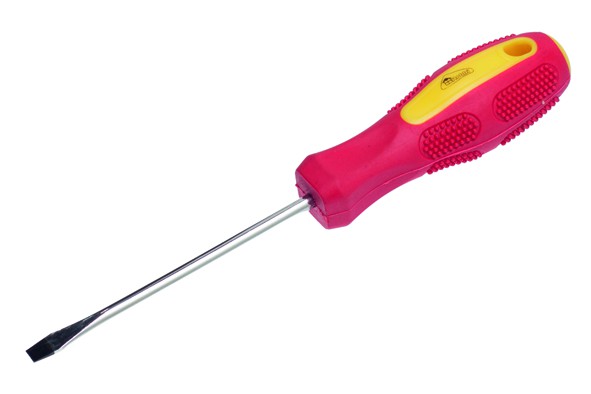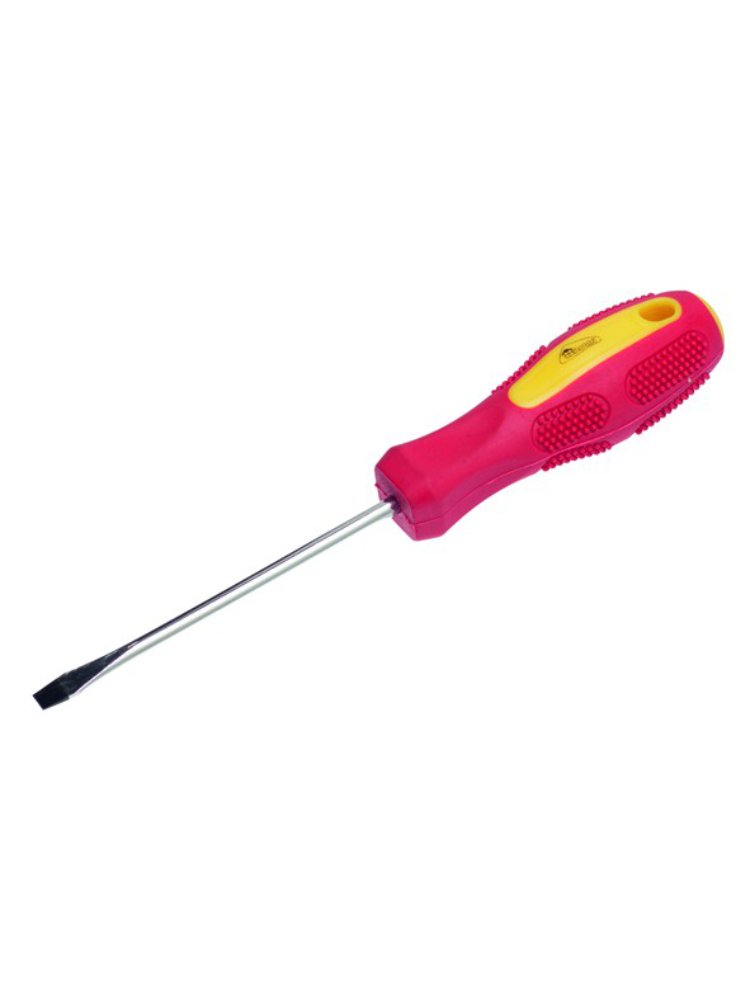 Предназначена для монтажа и демонтажа резьбовых соединений. Материал: Стержень - хромванадиевая сталь, двухкомпонентная рукоятка – пластик со вставками из термопластичной резины. Плоская отвертка с магнитным наконечником, эргономичной рукояткой и стержнем 100 мм из стали для быстрых и точных монтажных работ.