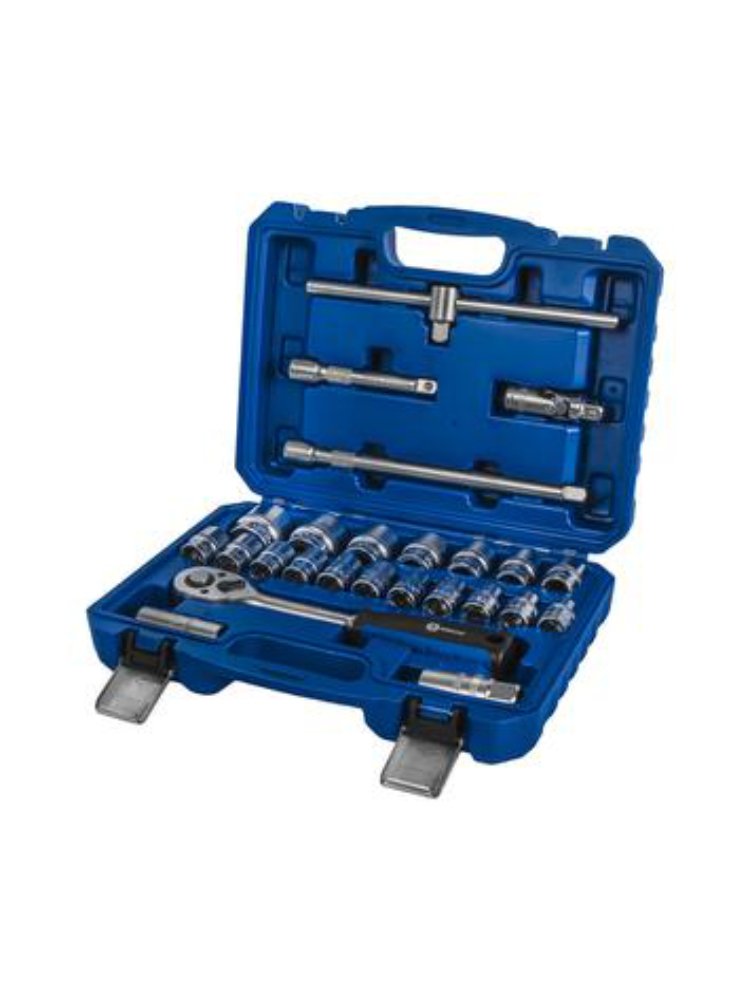 - Комплектация: 25 предметов — головки (17 шт), удлинители, трещотка, воротки и др.