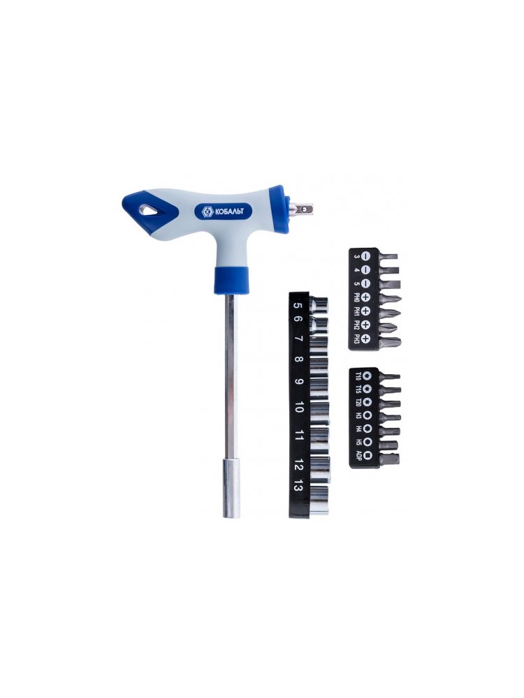 - 24 предмета: насадки-биты (шлицевые, крестовые, шестигранные, Torx), торцевые головки 1/4" и переходник