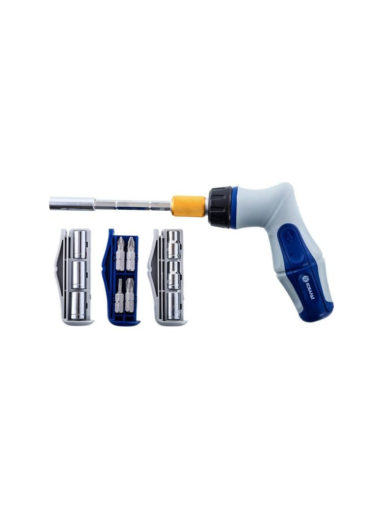 - 24 предмета: отвёртка с удобной пистолетной рукояткой Ultra Grip, набор бит и торцевых головок 1/4" различных профилей