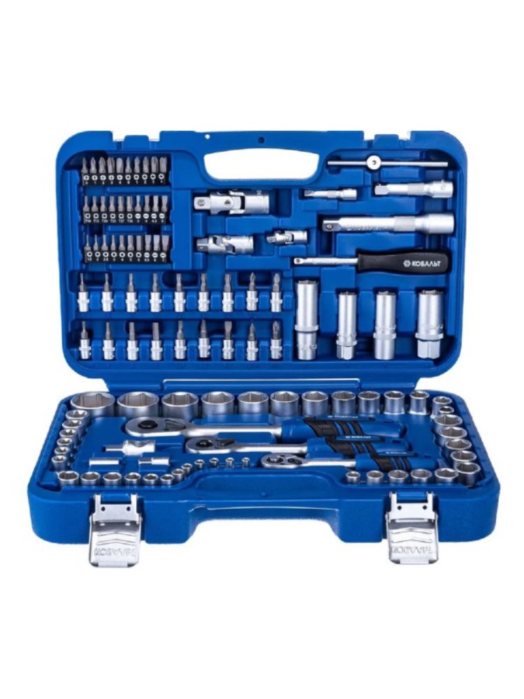 - Комплектация: торцевые головки 1/4'' и 1/2'', трещотки, удлинители, кардан, свечные головки, воротки, биты, шестигранники.