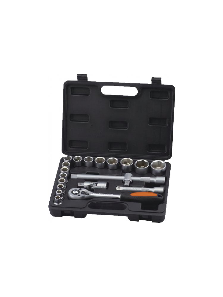 • В комплекте 20 предметов: трещотка с удобной рукояткой, шестигранные головки и удлинитель — оптимальный набор для работы с крепежом разных размеров.