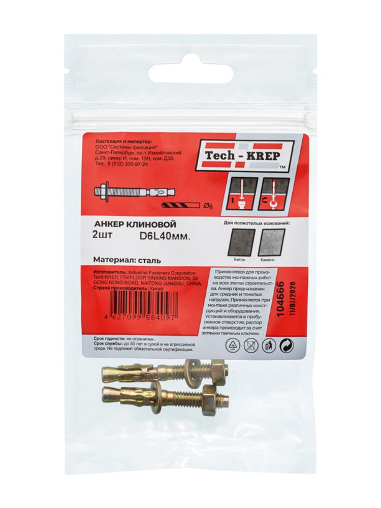 Анкер клиновой 6х40 мм Tech-Krep, 2 шт. в упаковке. Надежное крепление в бетоне и кирпиче. Прочная сталь, защита от коррозии, легкий монтаж.