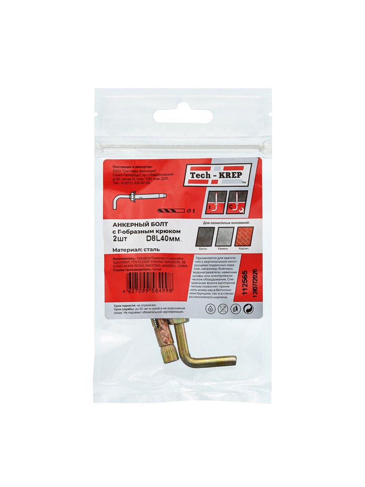 Анкерный болт с Г-обр. крюком HL 8x40 Tech-Krep (2 шт.) для надежного крепления в бетоне и кирпиче. Диаметр 8 мм, длина 40 мм, сталь с защитой от коррозии.