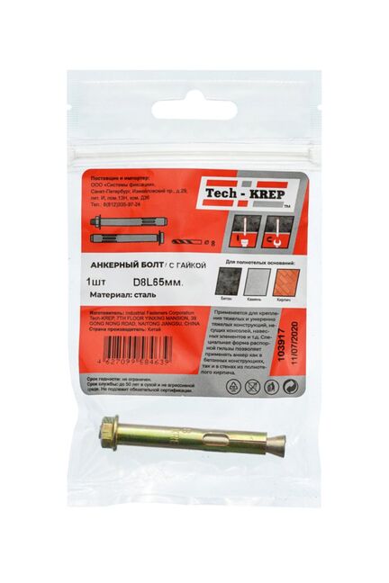 Анкерный болт с гайкой 8х65 от Tech-Krep — надежный крепежный элемент, предназначенный для создания прочных соединений в различных строительных конструкциях. Изготовлен из высококачественной стали с антикоррозийным покрытием, что обеспечивает долговечность даже в условиях повышенной влажности. Диаметр 8 мм и длина 65 мм позволяют использовать его для крепления элементов небольшой и средней нагрузки. Конструкция с гайкой упрощает монтаж и обеспечивает равномерное распределение нагрузки. Упаковка в виде пакета удобна для хранения и транспортировки.