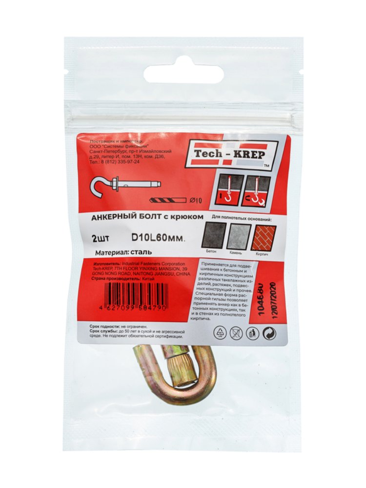 Анкерный болт с крюком 10х60 мм Tech-Krep, 2 шт. в упаковке. Прочная сталь, цинковое покрытие, для бетона и кирпича, высокая нагрузка.