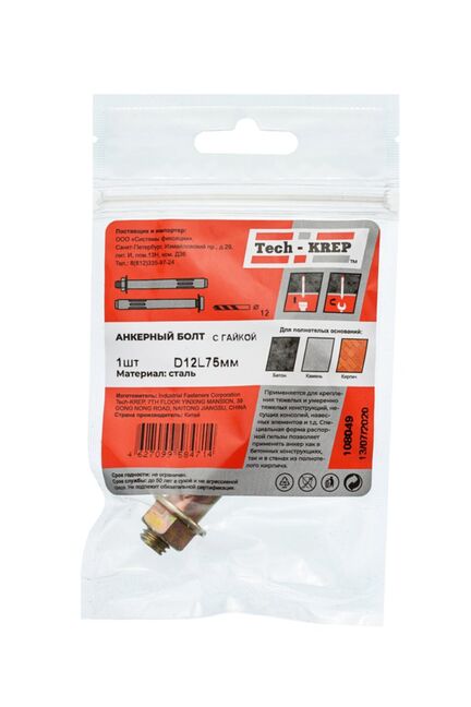 Анкерный болт с гайкой 12х75 (1 шт) - пакет Tech-Krep в Спасск-Дальний