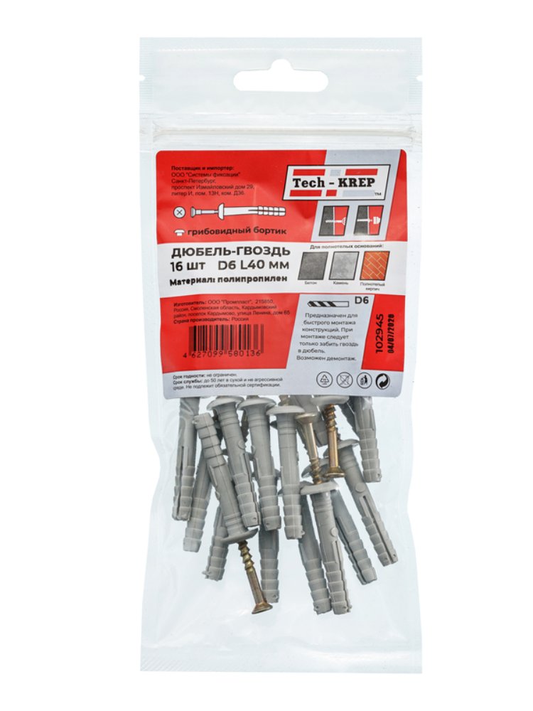 Дюбель-гвоздь 6х40 мм с грибовидной манжетой из полипропилена черного цвета от Tech-Krep предназначен для надежного крепления различных материалов к бетону, кирпичу и другим твердым основаниям. Упаковка содержит 16 штук, что удобно для небольших ремонтных и строительных работ. Конструкция с грибовидной манжетой обеспечивает плотное прилегание к поверхности, предотвращая проскальзывание крепежа. Изделие устойчиво к коррозии благодаря материалу изготовления, что гарантирует долговечность соединения даже в условиях повышенной влажности.