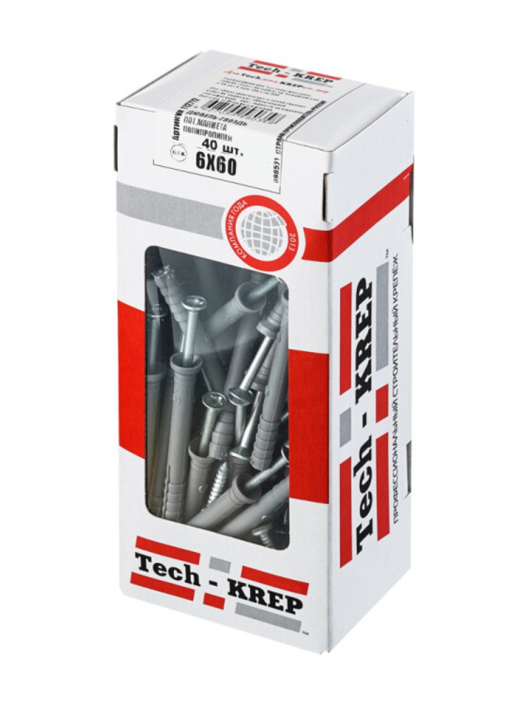 Дюбель-гвоздь 6х60 с потайной манжетой из полипропилена черного цвета от Tech-Krep. Комплект 40 шт. в коробке с окном. Для крепления к бетону и кирпичу.