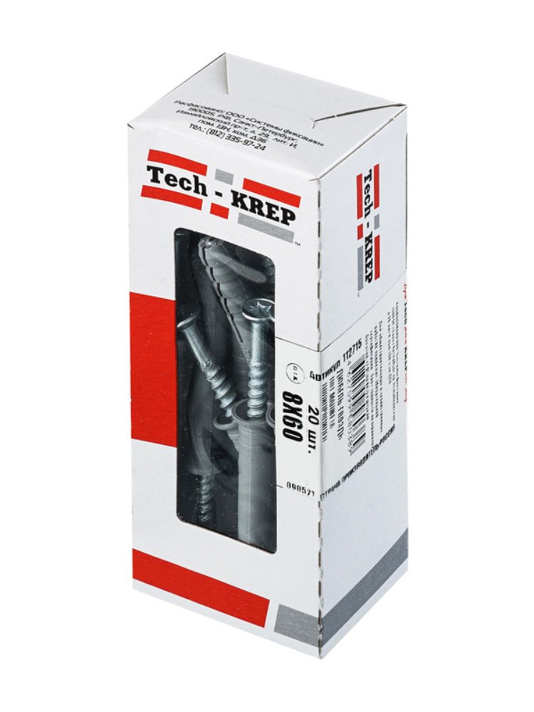 Дюбель-гвоздь 8х60 с потайной манжетой из полипропилена, черный, 20 шт в коробке с окном Tech-Krep. Надежное крепление к бетону и кирпичу.
