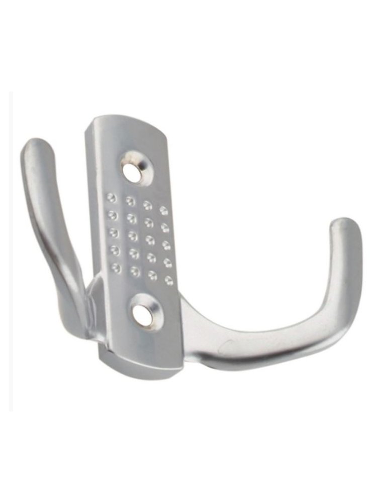 Надёжный металлический крючок на два рожка с серебристым покрытием, подходит для одежды и аксессуаров, прост в установке и долговечен.